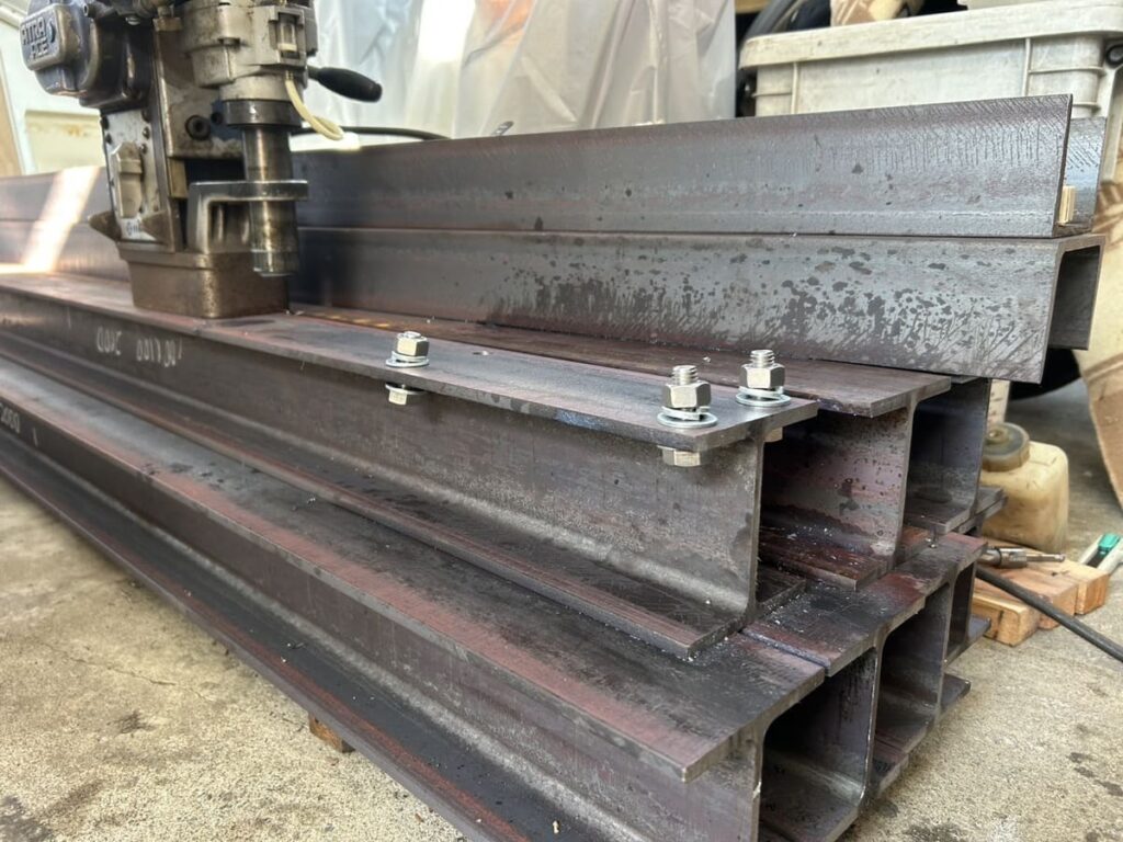 そして今回のメインイベント、**「300箇所の穴あけ加工」**です。 分厚いH鋼にハンドドリルで穴を開けるのは不可能です。手首が持ちません。