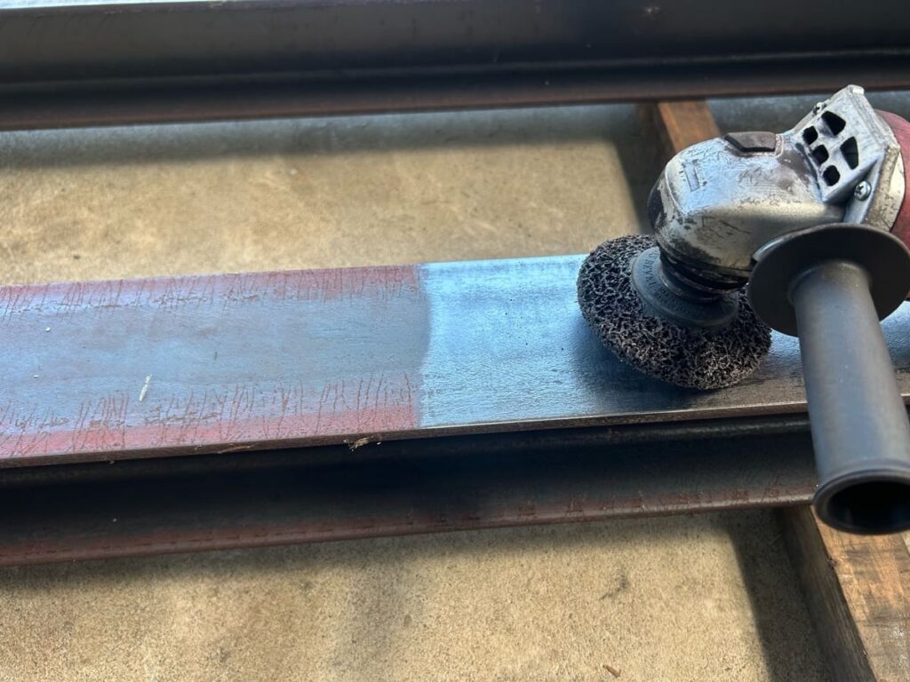 海水に浸かる船台にとって、塗装剥がれ=死(錆)です。 そこで、ディスクグラインダーを使って黒皮を削り落とします。