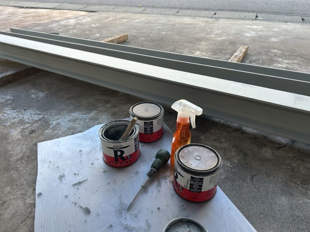 加工が終わった部材から、錆止めの塗装に入ります。 選んだのは、亜鉛メッキ塗料の最高峰**「ローバル(ROVAL)」**。