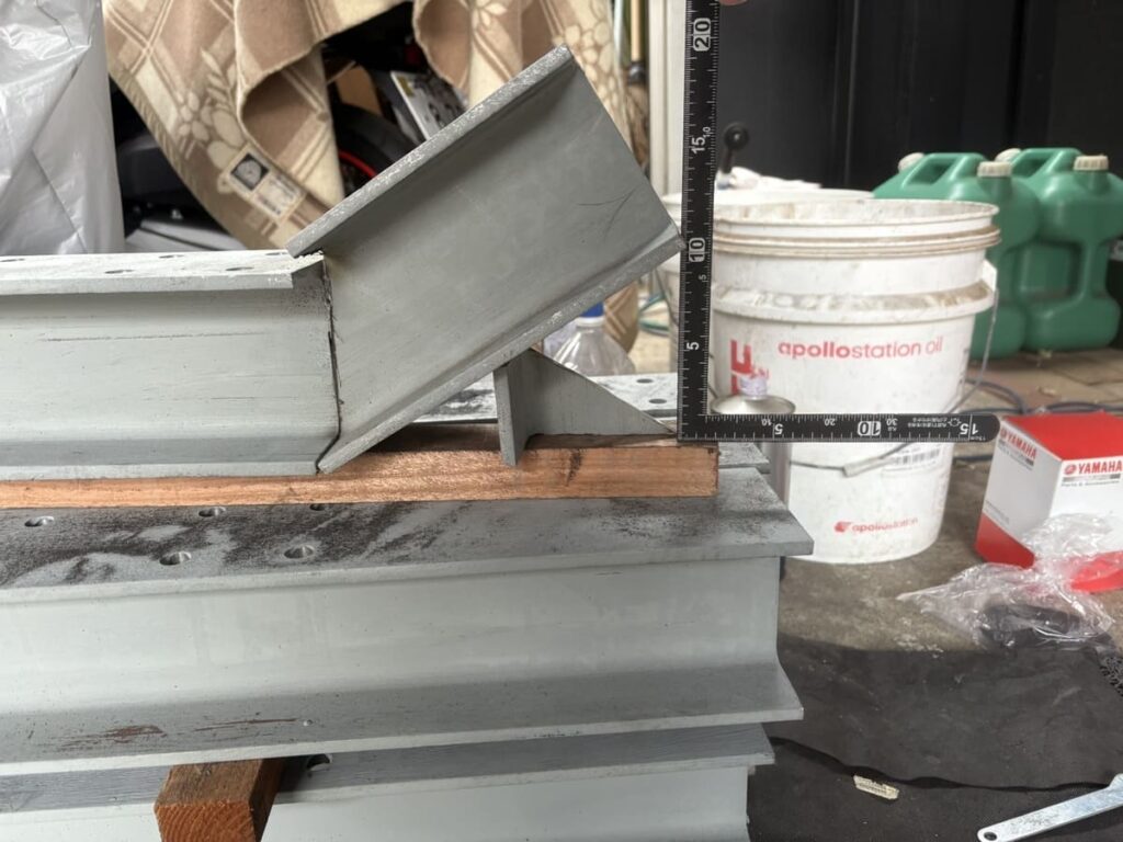今回の船台は、タイヤを使わずレールの上を滑らせる方式です。 そのため、H鋼の先端(足の部分)を、雪山を滑るソリのように「斜めにカット」して、段差に引っかからないように加工する必要があります。