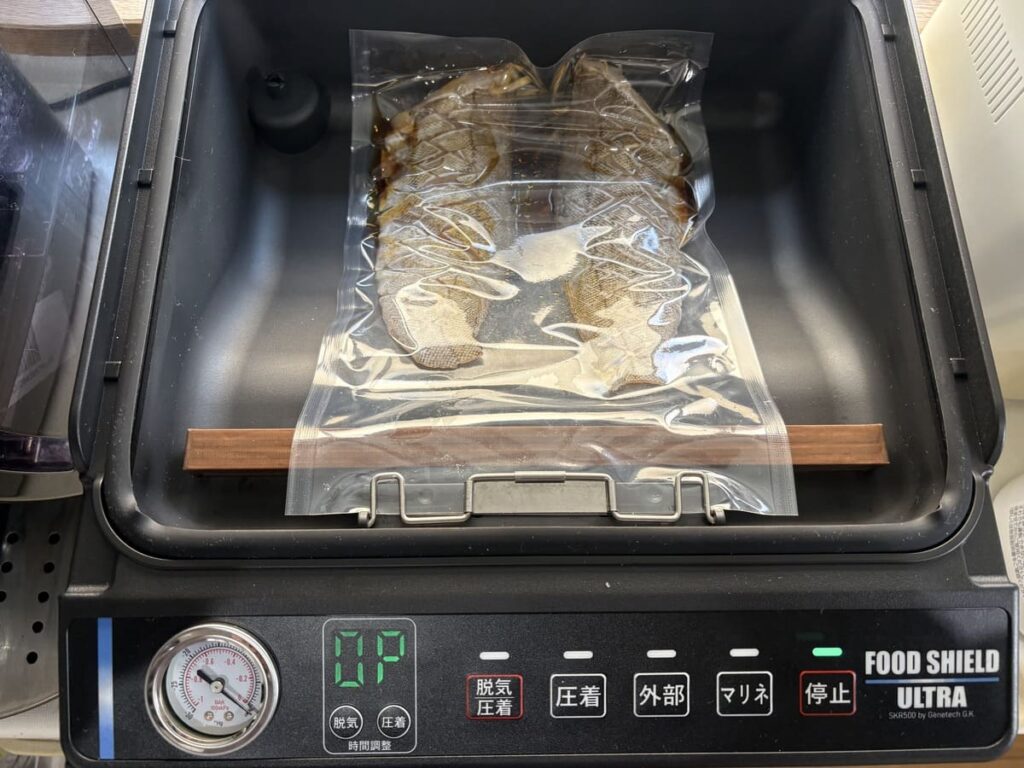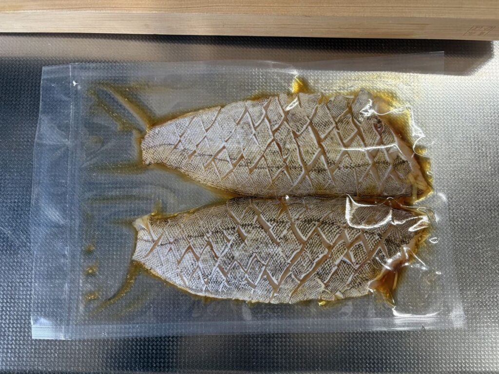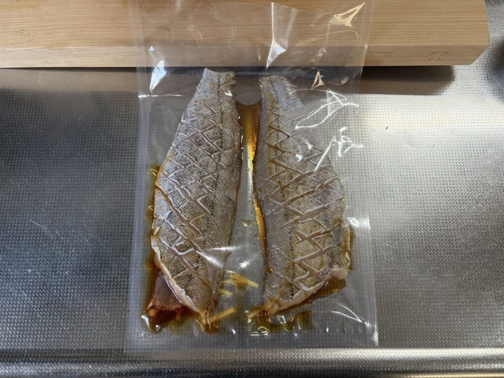 ここからが魔法の時間。ナイロンポリ袋に魚と少量の調味液を入れたら、真空パック機の出番です。 真空の圧力(-98kPa)をかけることで、魚の細胞内の空気が抜け、そこに「本物の醤油と純米酒のアミノ酸」が強制的に押し込まれます。少ない調味料でも、中まで味がバシッと決まる食のサイエンスです!