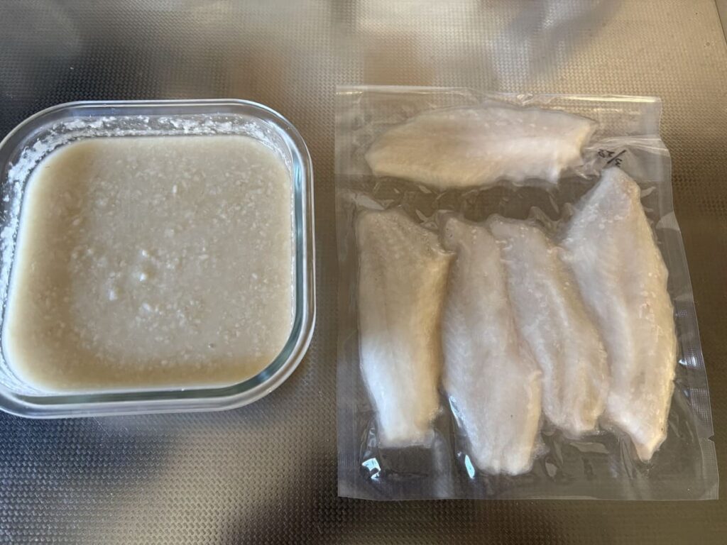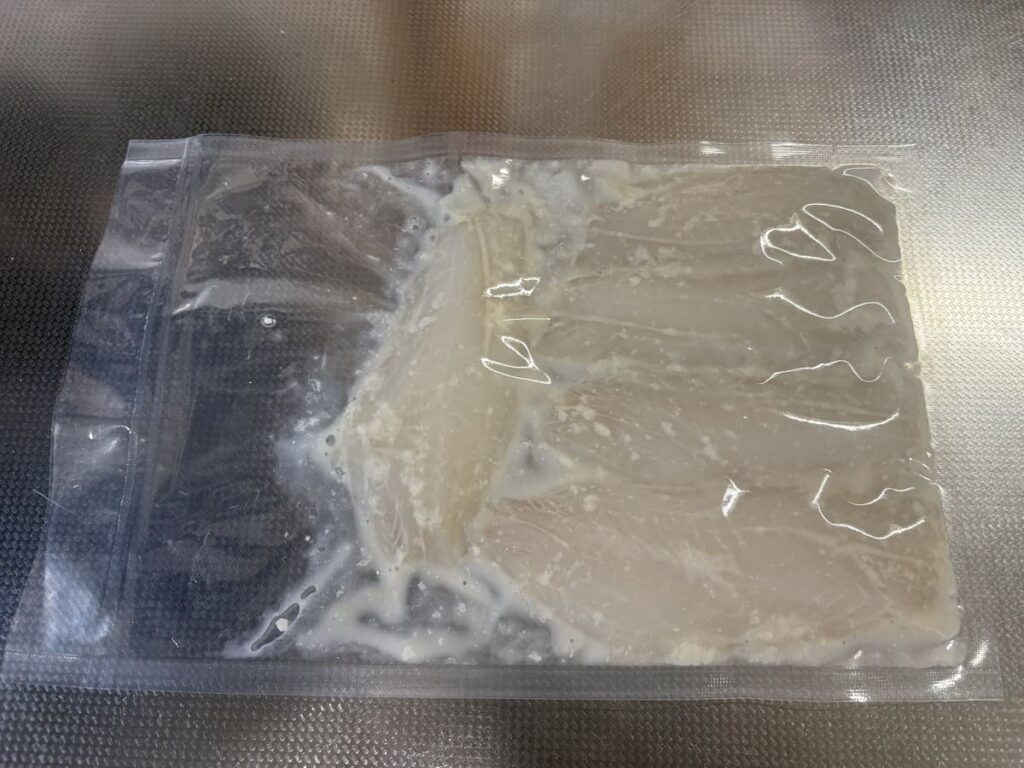 空気が完全に抜け、塩麹が魚の身にピタッと密着した「未来への投資・熟成待ちパック」の完成です。これを冷蔵庫に入れ、半日〜1日寝かせます。