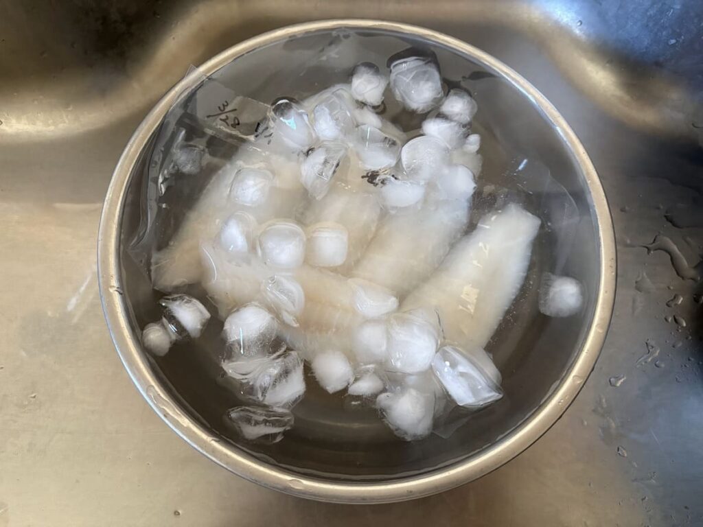 まずは解凍です。ここで絶対にやってはいけないのが「常温解凍」や「お湯での解凍」。 写真のように「たっぷりの氷水(0℃近い温度)」にドボンと沈めて解凍します。この「氷水解凍のサイエンス」により、魚の旨味であるドリップの流出を極限まで抑えることができます。