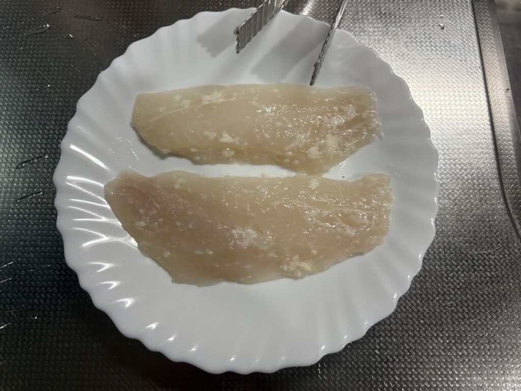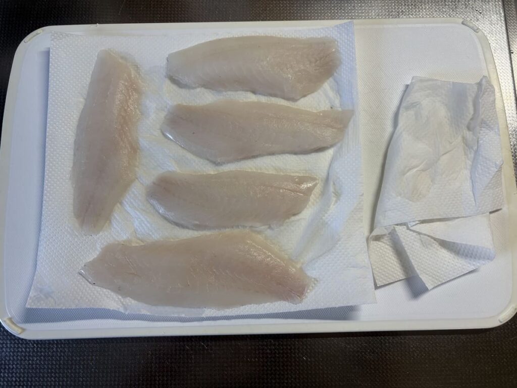 解凍できたら、袋から取り出し、キッチンペーパーで表面の水分(ドリップ)をこれでもか!というほど徹底的に拭き取ります。 ここが最重要ポイント。水分が残っていると塩麹が薄まり、生臭さの原因になってしまいます。