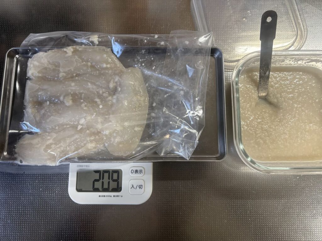 水気を拭き取ったら計量です。 塩麹漬けの「黄金比」は、【魚の重量に対して10%】の塩麹。 今回はマゾイが190gだったので、約19gの塩麹を投入し、身が崩れないように優しく揉み込みます。