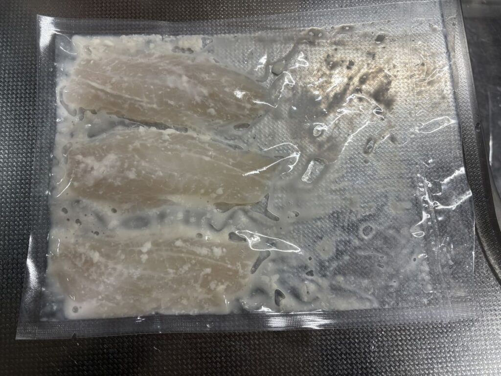 塩麹を揉み込んだら、再び真空パックにして冷蔵庫で寝かせます。 しかし、塩麹は水分が多いペースト状。普通のノズル式真空パック機だと、液体を吸い込んで機械が壊れてしまいます。
