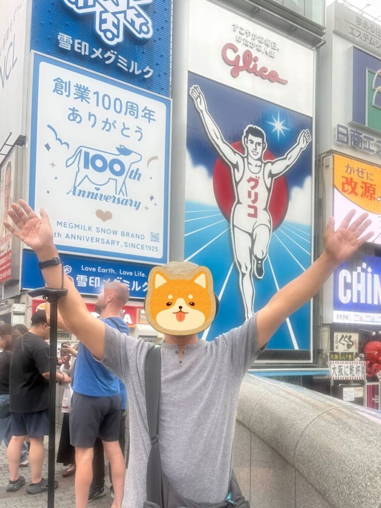 道頓堀では、痛む足で踏ん張りながら、執念の「グリコポーズ」 杖が写り込んでいますが、これも旅の勲章です。