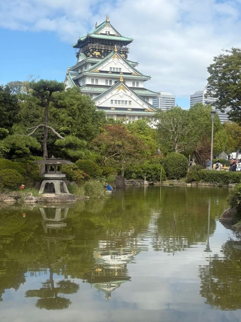 見てください、この大阪城。 日本庭園の水面に天守閣が反射して、逆さ富士ならぬ「逆さ大阪城」 今回の旅のベストショットです。