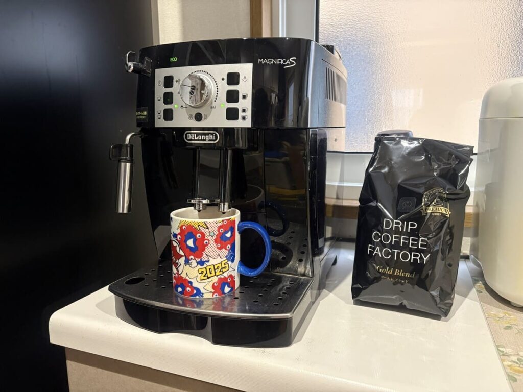 激闘の翌日。私の手には、あの奇抜な「ミャクミャク様」のマグカップが握られています。 こいつの不敵な笑み(?)を眺めながら飲むコーヒーは、格別の味。